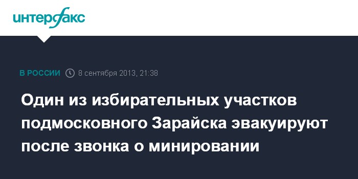 Москва. 8 сентября. INTERFAX.RU - Один из территориальных избирательных участков подмосковного Зарайска эвакуируют в связи с сообщением о заложенной бомбе, сообщил "Интерфаксу" председатель Мособлизбиркома Ирек Вильданов.