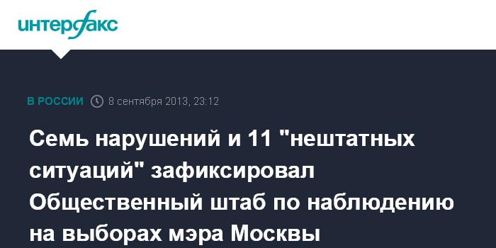 Москва. 8 сентября. INTERFAX.RU - Общественный штаб по наблюдению на выборах мэра Москвы зафиксировал менее 10 нарушений в ходе подсчета голосов.