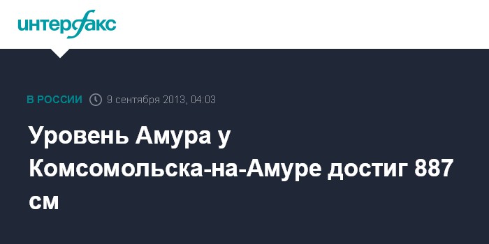 Хабаровск. 9 сентября. INTERFAX.RU - Уровень Амура в районе Комсомольска-на-Амуре продолжает расти, к утру понедельника он достиг отметки 887 см, поднявшись за сутки на 5 см, сообщила пресс-служба ГУ МЧС по Хабаровскому краю.