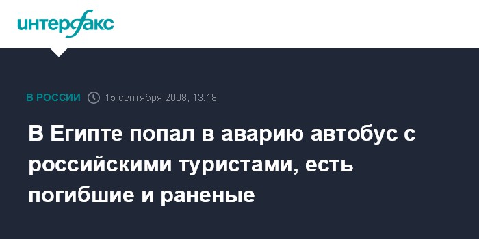 Москва. 15 сентября. INTERFAX.RU – Очередное дорожно-транспортное происшествие с участием российских туристов произошло в понедельник утром в Египте примерно в 200 км от Каира, сообщил порталу "Интерфакс-Туризм" сотрудник консульского отдела посольства РФ в Египте Дмитрий Грачев.