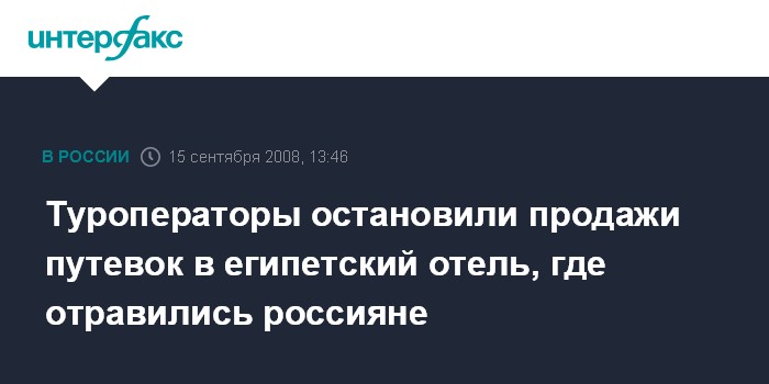 Москва. 15 сентября. INTERFAX.RU – Туроператоры приостановили продажи в отель "Шератон Шарм Резорт" 5* на египетском курорте Шарм-Эль-Шейх, где в пятницу отравились около 80 российских туристов, сообщила в понедельник "Интерфакс-Туризму" пресс-секретарь Российского союза туриндустрии (РСТ) Ирина Тюрина.