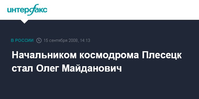 Москва. 15 сентября. INTERFAX.RU - Начальником космодрома Плесецк (Архангельская область) назначен генерал-майор Олег Майданович, сообщил "Интерфаксу-АВН" в понедельник помощник командующего Космическими войсками по информационному обеспечению подполковник Алексей Золотухин.