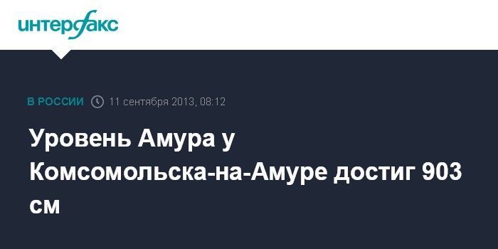 Хабаровск. 11 сентября. INTERFAX.RU - Уровень Амура в черте Комсомольска-на-Амуре к полудню среды поднялся до 903 см, увеличившись с 08:00 на 1 см, сообщает пресс-служба ГУ МЧС по Хабаровскому краю в среду.