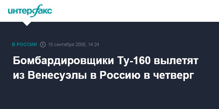 Москва. 15 сентября. INTERFAX.RU - Два стратегических бомбардировщика Ту-160 18 сентября вылетят на родину из Венесуэлы, сообщил "Интерфаксу-АВН" в понедельник помощник главкома ВВС РФ Владимир Дрик.