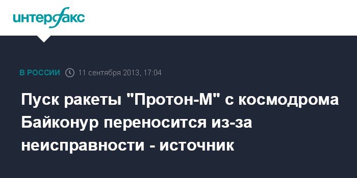Байконур. 11 сентября. INTERFAX.RU - На Байконуре в ходе проведения заключительных проверок ракеты "Протон" со спутником Astra 2E обнаружена неисправность, сообщил "Интерфаксу" источник на космодроме.
