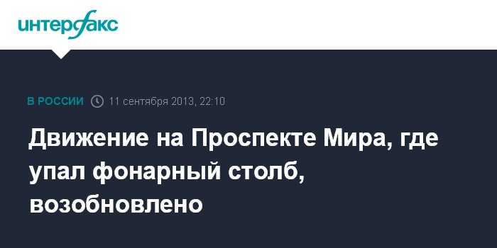 Москва. 11 сентября. INTERFAX.RU - В Москве восстановлено движение автомобилей на Проспекте Мира, где образовалась пробка из-за фонарного столба, упавшего на проезжую часть.