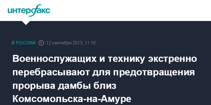 Москва. 12 сентября. INTERFAX.RU - В связи с угрозой прорыва дамбы близ Комсомольска-на-Амуре Минобороны РФ срочно перебрасывает в этот район военнослужащих и специальную технику, сообщили в четверг "Интерфаксу-АВН" в Управлении пресс-службы и информации Минобороны РФ.