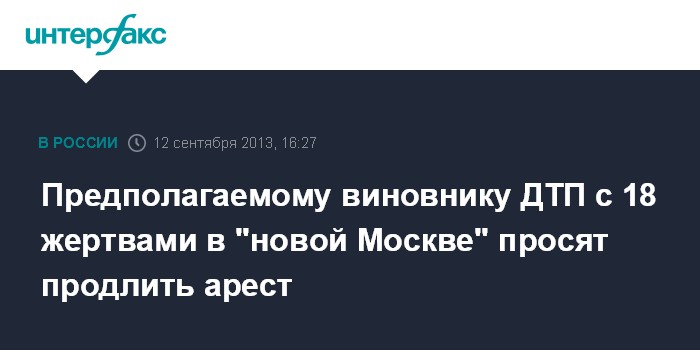 Москва. 12 сентября. INTERFAX.RU - Следствие вышло с ходатайством о продлении срока содержания под стражей предполагаемому виновнику ДТП в "новой Москве", где в результате столкновения "КамАЗа" и автобуса погибли 18 человек, сообщили "Интерфаксу" в пресс-службе ГУ МВД России по Москве.
