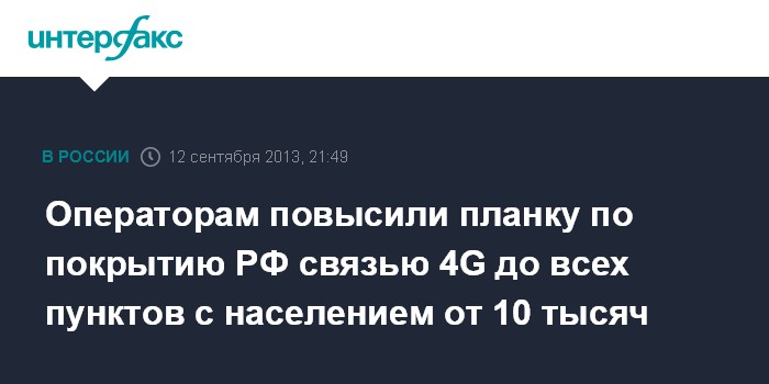 Москва. 12 сентября. INTERFAX.RU - Операторы "большой тройки": ОАО "Мобильные Телесистемы"(МТС), ОАО "Вымпелком" и ОАО "Мегафон" - согласились повысить планку по размеру покрытия населенных пунктов РФ связью четвертого поколения LTE. Если в лицензии указано, что покрытие к 2019 году должно быть во всех населенных пунктах с населением более 50 тыс. человек, то теперь операторы готовы построить сети во всех пунктах, где проживает более 10 тыс. человек.