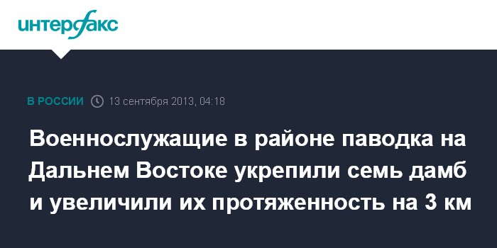 Москва. 13 сентября. ИНТЕРФАКС - Военнослужащие Минобороны России укрепили семь водозащитных дамб в населенных пунктах ДФО, протяженность которых увеличилась на 3 тыс. метров, сообщили в пятницу "Интерфаксу" в управлении пресс-службы и информации Минобороны РФ.
