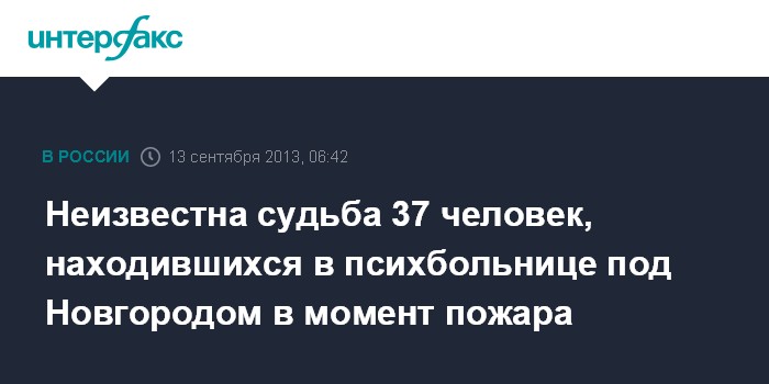 Москва. 13 сентября. ИНТЕРФАКС - Судьба 37 человек неизвестна в результате пожара в психоневрологическом интернате в Новгородской области, сообщил "Интерфаксу" начальник Управления информации МЧС Олег Воронов.