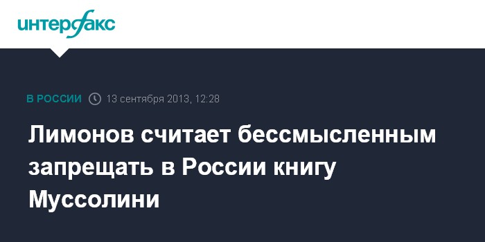 Москва. 13 сентября. INTERFAX.RU - Оппозиционер и писатель, лидер незарегистрированной партии "Другая Россия" Эдуард Лимонов не видит смысла в признании экстремисткой книги итальянского диктатора Бенито Муссолини "Третий путь: Без демократов и коммунистов".