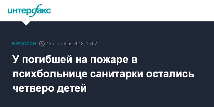 Великий Новгород. 13 сентября. INTERFAX.RU - У погибшей на пожаре в корпусе психоневрологического интерната в деревне Лука Новгородской области остались четверо детей и супруг.