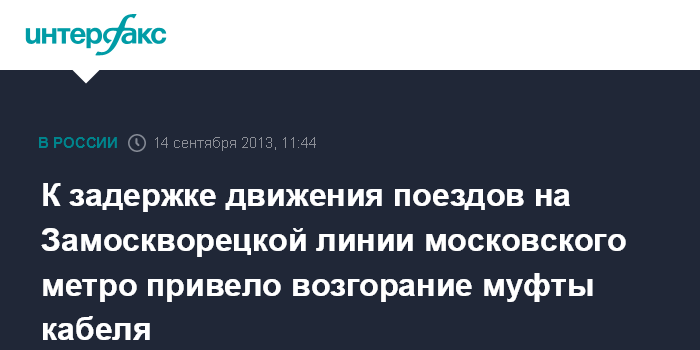 "Утром 14 сентября на Замоскворецкой линии метрополитена произошла кратковременная задержка движения. Причина временной остановки - возгорание муфты кабеля напряжением 400 вольт на перегоне между станциями "Павелецкая" и "Автозаводская" (2-й путь)", - сказали в пресс-службе "Интерфаксу" в субботу.