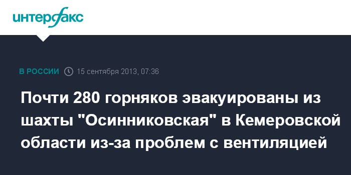 Кемерово. 15 сентября. INTERFAX.RU - Перебои в энергоснабжении привели к остановке главного вентилятора на шахте "Осинниковская"(город Осинники, Кемеровская область), под землей в этот момент находились 289 человек, сообщает пресс-служба регионального ГУ МЧС.