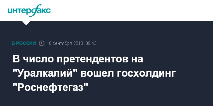 Москва. 16 сентября. INTERFAX.RU - Госхолдинг "Роснефтегаз" интересуется покупкой доли Сулеймана Керимова в "Уралкалии", сообщили "Ведомости" со ссылкой на несколько источников.