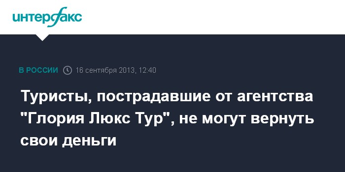 Москва. 16 сентября. INTERFAX.RU - Туристы, пострадавшие от московского агентства "Глория Люкс Тур", до сих пор не могут вернуть свои деньги, сообщает Ассоциация туроператоров России (АТОР).