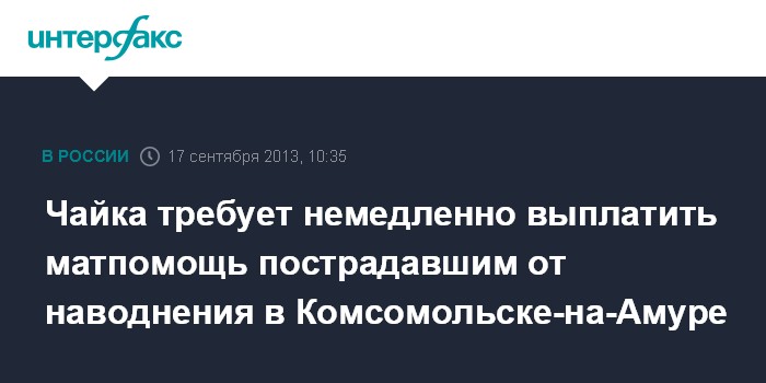 Хабаровск. 17 сентября. INTERFAX.RU - Генеральный прокурор России Юрий Чайка потребовал провести проверку расходования средств, выделенных на выплаты пострадавшим от подтопления в Комсомольске-на-Амуре.