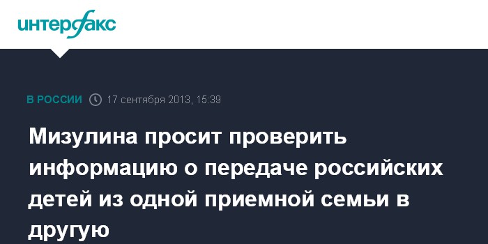 Москва. 17 сентября. INTERFAX.RU - Глава Комитета Госдумы по вопросам семьи, женщин и детей Елена Мизулина (фракция "Справедливая Россия") просит Генпрокуратуру и Минобрнауки проверить информацию СМИ об американских приемных родителях, которые по интернету подыскивают новую семью для своих усыновленных детей.