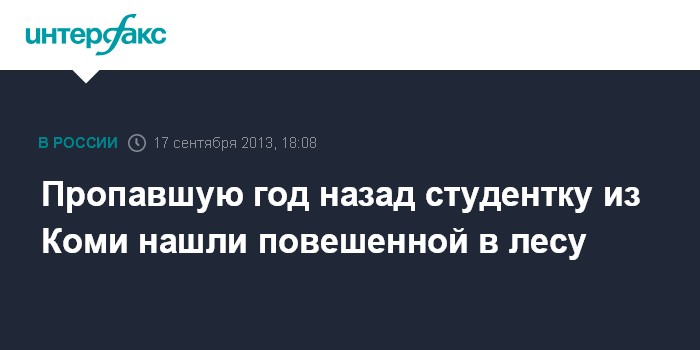 Сыктывкар. 17 сентября. INTERFAX.RU - В лесу в Коми обнаружили тело 19-летней студентки вуза Сыктывкара Юлии Лобковой, пропавшей год назад, сообщили "Интерфаксу" в пресс-службе регионального СКР во вторник.
