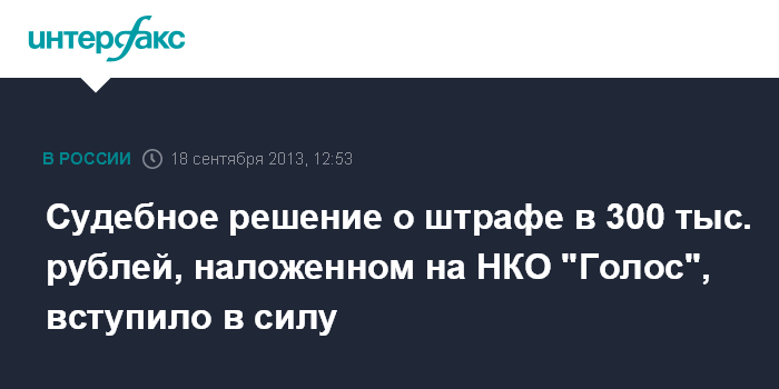 Судебное решение о штрафе в 300 тыс. рублей, наложенном на НКО "Голос", вступило в силу
