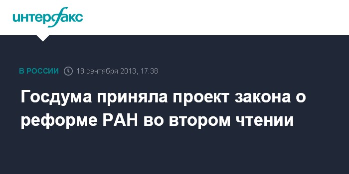 Москва. 18 сентября. INTERFAX.RU - Законопроект о реформе Российской академии наук (РАН) принят Госдумой во втором чтении.
