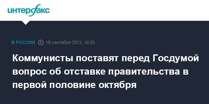 "Предложение о том, чтобы отправить правительство РФ в отставку, будет внесено в Госдуму в первой половине октября", - сказал "Интерфаксу" источник в КПРФ в среду.