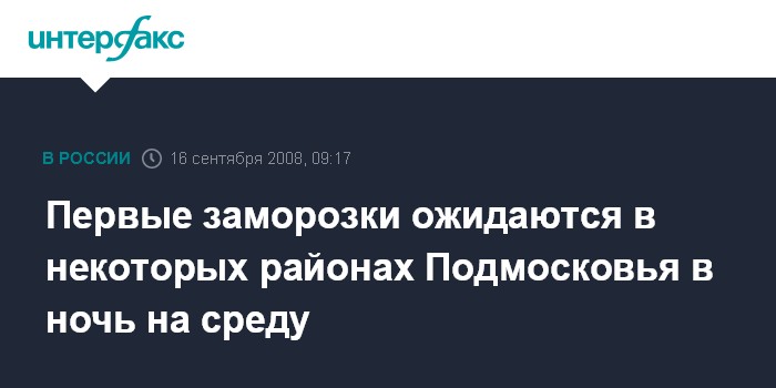 Москва. 16 сентября. INTERFAX.RU - Заморозки на почве могут быть отмечены предстоящей ночью в отдельных районах Московской области, сообщили "Интерфаксу" в Гидрометеобюро Москвы и Московской области во вторник.
