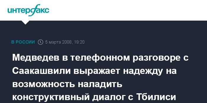 Москва. 5 марта. ИНТЕРФАКС - Избранный президент РФ Дмитрий Медведев в телефонном разговоре с грузинским лидером Михаилом Саакашвили выразил надежду на то, что Москве и Тбилиси удастся наладить конструктивный диалог, несмотря на ранее упущенные грузинской стороной возможности.