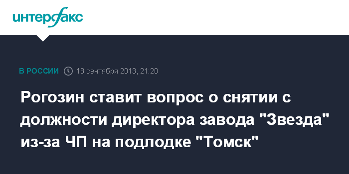 Ижевск. 18 сентября. INTERFAX.RU - Вице-премьер Дмитрий Рогозин поставил вопрос о снятии с должности директора Дальневосточного судостроительного завода "Звезда" Владимира Аверина. Причиной такого кадрового решения стало ЧП на АПЛ "Томск".