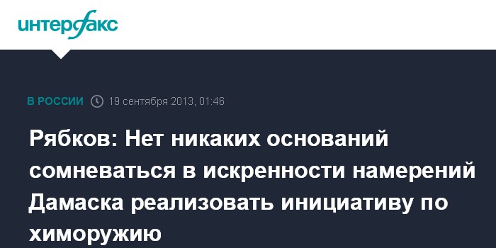 Дамаск. 19 сентября. ИНТЕРФАКС - У российской стороны нет никаких сомнений в искренности намерений сирийского руководства ликвидировать свое химическое оружие, заявил замглавы МИД РФ Сергей Рябков