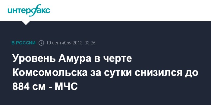 Хабаровск. 19 сентября. ИНТЕРФАКС - ДАЛЬНИЙ ВОСТОК - Амур в районе Комсомомльска продолжает стабильное снижение, за сутки уровень воды упал на 10 см, по данным на утро четверга, он составляет 884 см, сообщает пресс-служба ГУ МЧС по региону в четверг.