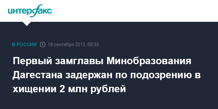 Москва. 19 сентября. INTERFAX.RU - Первый замминистра образования и науки Дагестана задержан по подозрению в мошенничестве на сумму более 2 миллионов рублей, сообщили в четверг "Интерфаксу" в пресс-центре МВД.