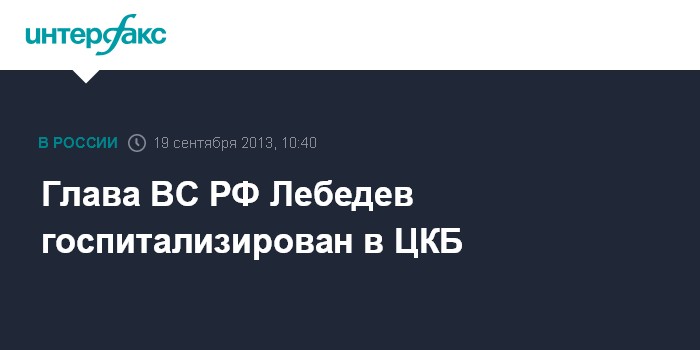 Москва. 19 сентября. INTERFAX.RU - Председатель Верховного суда России Вячеслав Лебедев, доставленный накануне самолетом МЧС России в Москву из Ганы, где он пострадал в результате ДТП, госпитализирован в Центральную клиническую больницу, сообщил "Интерфаксу" в четверг официальный представитель ВС Павел Одинцов.
