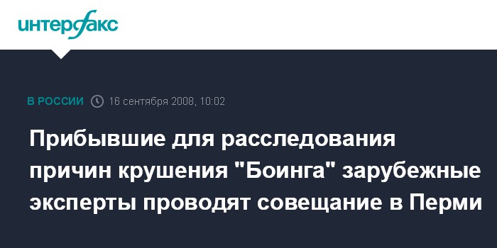 Москва. 16 сентября. INTERFAX.RU - Зарубежные эксперты прибыли в Пермь для расследования причин крушения самолета, сообщили агентству "Интерфакс-Поволжье" во вторник в пресс-службе губернатора Пермского края.