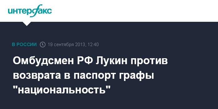 Москва. 19 сентября. INTERFAX.RU - Уполномоченный по правам человека в РФ Владимир Лукин считает вредной идею вернуть в паспорта "графу" национальность.
