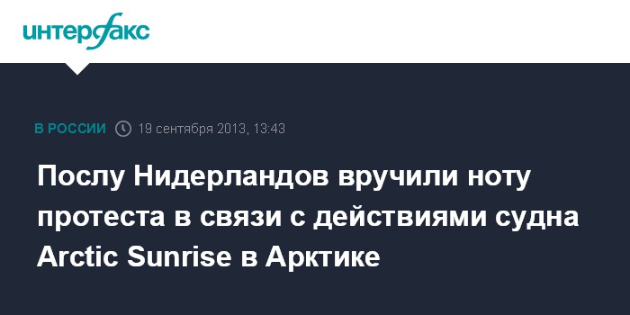 Москва. 19 сентября. INTERFAX.RU - Посол Нидерландов в Москве был вызван в МИД РФ в связи с действиями судна Arctic Sunrise, принадлежащего организации Greenpeace сообщает в среду МИД России.