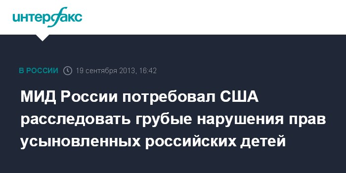 "К американской стороне был обращен настоятельный призыв провести тщательное и беспристрастное расследование всех обстоятельств дела, установить личности всех российских детей, оказавшихся жертвами "интернет-биржи", предоставить компетентным российским структурам исчерпывающую информацию об их нынешнем положении, обеспечить беспрепятственный консульский доступ к детям и привлечение к ответственности всех виновных в нарушениях их прав", - говорится в сообщении, опубликованном на сайте МИД РФ.