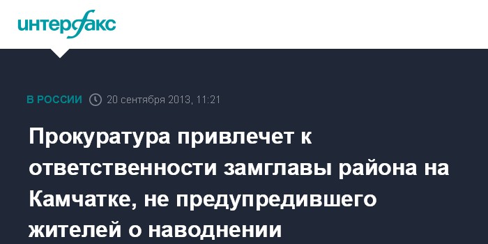 Петропавловск-Камчатский. 20 сентября. INTERFAX.RU - Прокуратура выявила признаки халатности в действиях заместителя главы администрации Соболевского района Камчатского края, где жители не были вовремя предупреждены о надвигающемся наводнении.