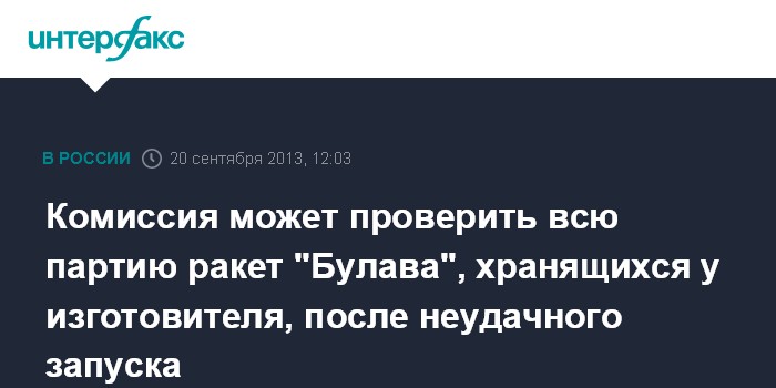 Москва. 20 сентября. INTERFAX.RU - Находящиеся на хранении на заводе-изготовителе межконтинентальные баллистические ракеты "Булава" может проверить комиссия, расследующая причины неудачного запуска ракеты.