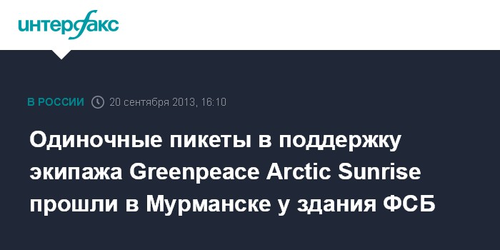 Одиночные пикеты в поддержку экипажа Greenpeace Arctic Sunrise прошли в Мурманске у здания ФСБ