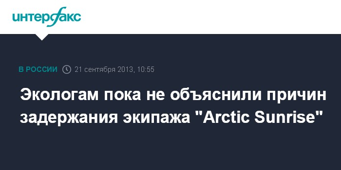 Москва. 21 сентября. NTERFAX.RU - Экологи заявили, что ФСБ до сих пор не предъявила официальных обвинений экипажу ледокола "Arctic Sunrise", который был задержан в Печорском море.