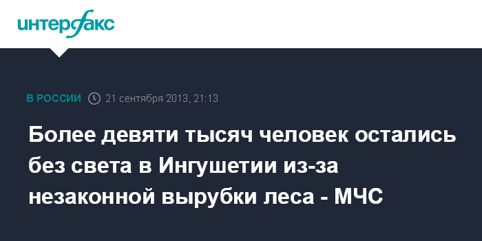 Москва/Магас. 21 сентября. ИНТЕРФАКС - Три населенных пункта в Сунженском районе республики Ингушетия оказались обесточены из-за падения дерева на ЛЭП в результате незаконной вырубки леса, сообщает ГУ МЧС РФ по республике.