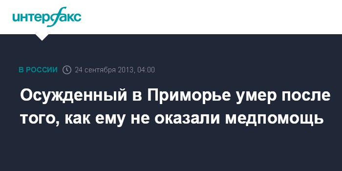 Владивосток. 24 сентября. ИНТЕРФАКС-ДАЛЬНИЙ ВОСТОК - Уголовное дело возбуждено в Приморье после смерти осужденного, который был болен, сообщает прокуратура края.