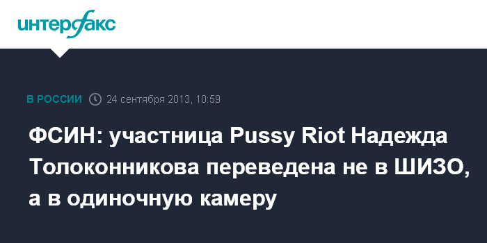 Москва. 24 сентября. INTERFAX.RU - Федеральная служба исполнения наказаний опровергла информацию о том, что осужденная участница Pussy Riot Надежда Толоконникова переведена в штрафной изолятор в колонии.