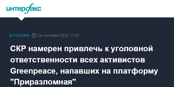 Москва. 24 сентября. INTERFAX.RU - Следственный комитет РФ возбудил уголовное дело по статье "Пиратство" в связи с попыткой проникновения активистов "Гринпис" на стационарную платформу "Приразломная" в акватории Баренцева моря.