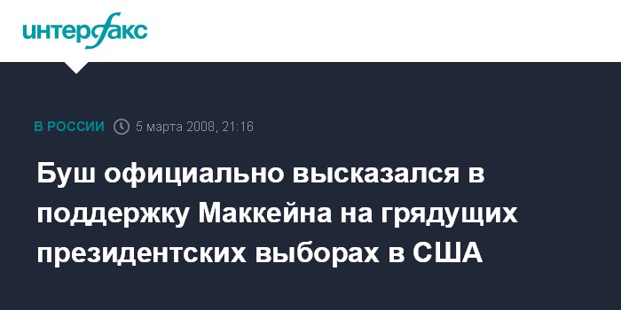 Вашингтон. 5 марта. ИНТЕРФАКС - Президент США Джордж Буш в среду официально поддержал республиканца Джона Маккейна в качестве кандидата в президенты США.