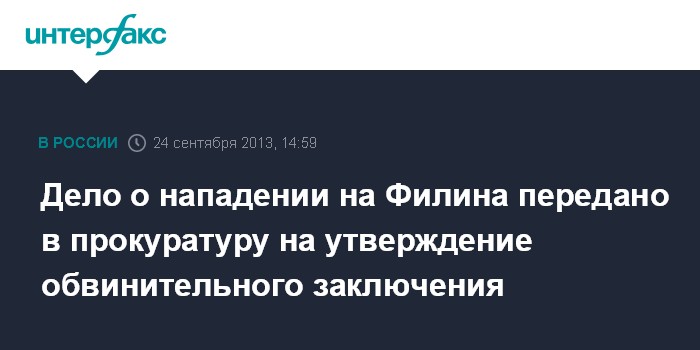 Москва. 24 сентября. INTERFAX.RU - Столичная полиция передала в прокуратуру для утверждения обвинительного заключения дело о нападении на художественного руководителя балетной труппы Большого театра Сергея Филина, сообщили "Интерфаксу" в пресс-службе главка столичной полиции.