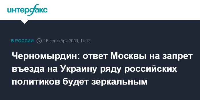 Москва. 16 сентября. INTERFAX.RU - Посол России на Украине Виктор Черномырдин считает запрет на въезд на территорию РФ ряду украинских политиков и бизнесменов ответом на действия Киева, который ранее не пустил на свою территорию ряд российских политиков.