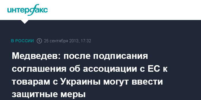 Астана. 25 сентября. INTERFAX.RU - Премьер-министр РФ Дмитрий Медведев не исключил применения защитных мер к товарам с Украины после подписания соглашения об ассоциации с ЕС.